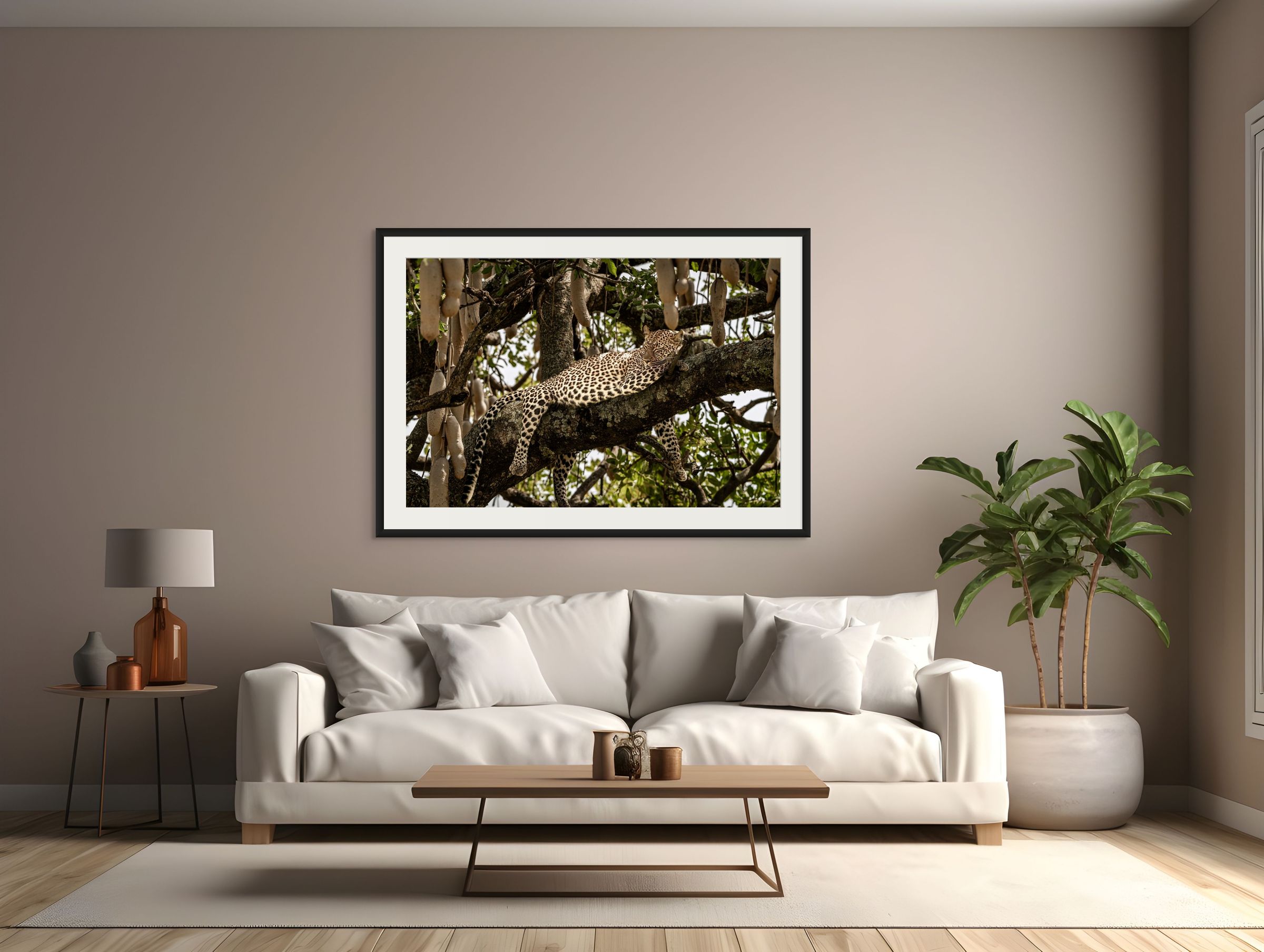 In the heart of the Maasai Mara, a leopard rests gracefully in the branches of a sausage tree, its spotted coat blending seamlessly with the dappled sunlight filtering through the leaves. This majestic creature, embodying the essence of the wild, serves as a reminder of the delicate balance of nature we strive to protect.