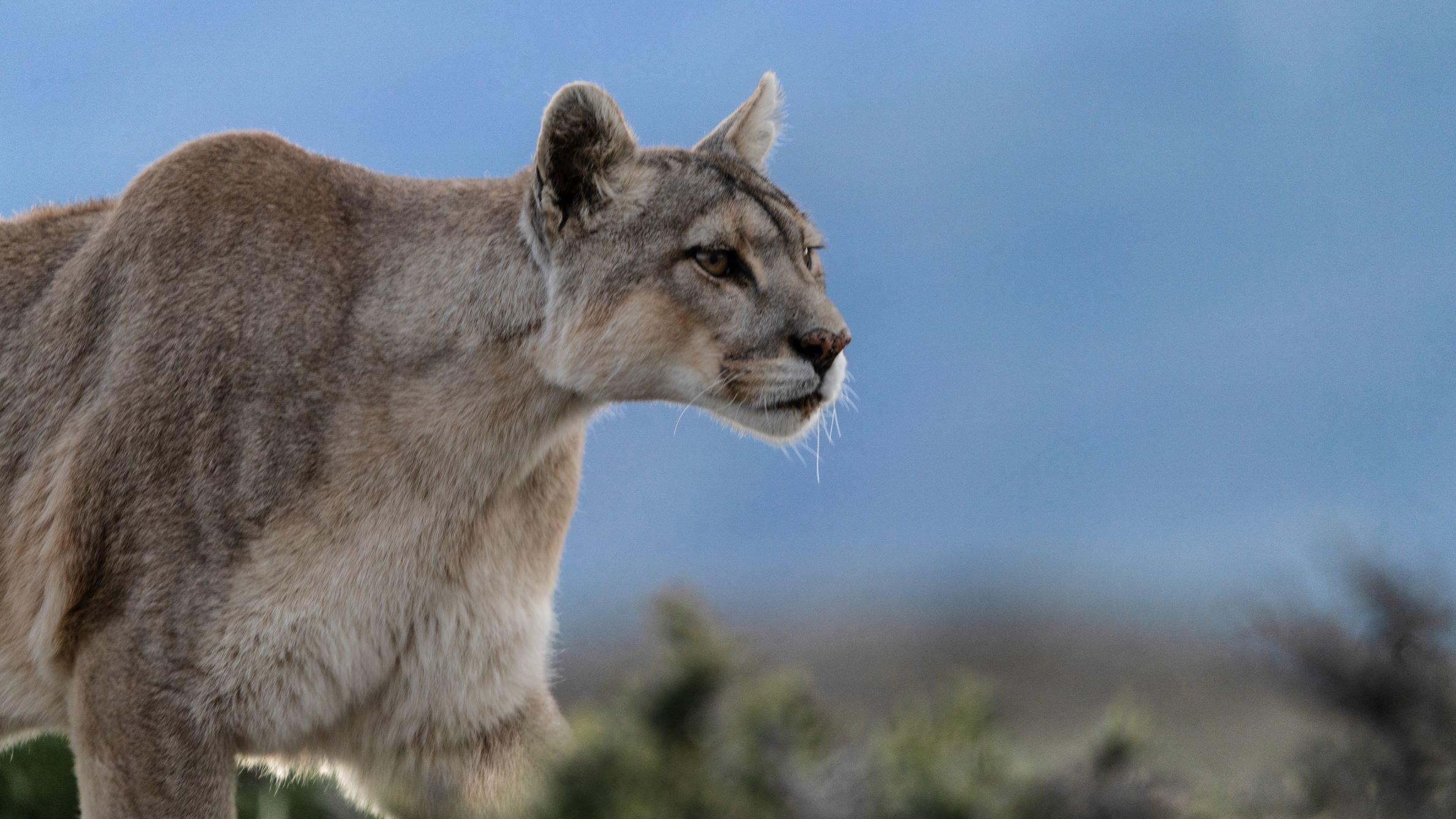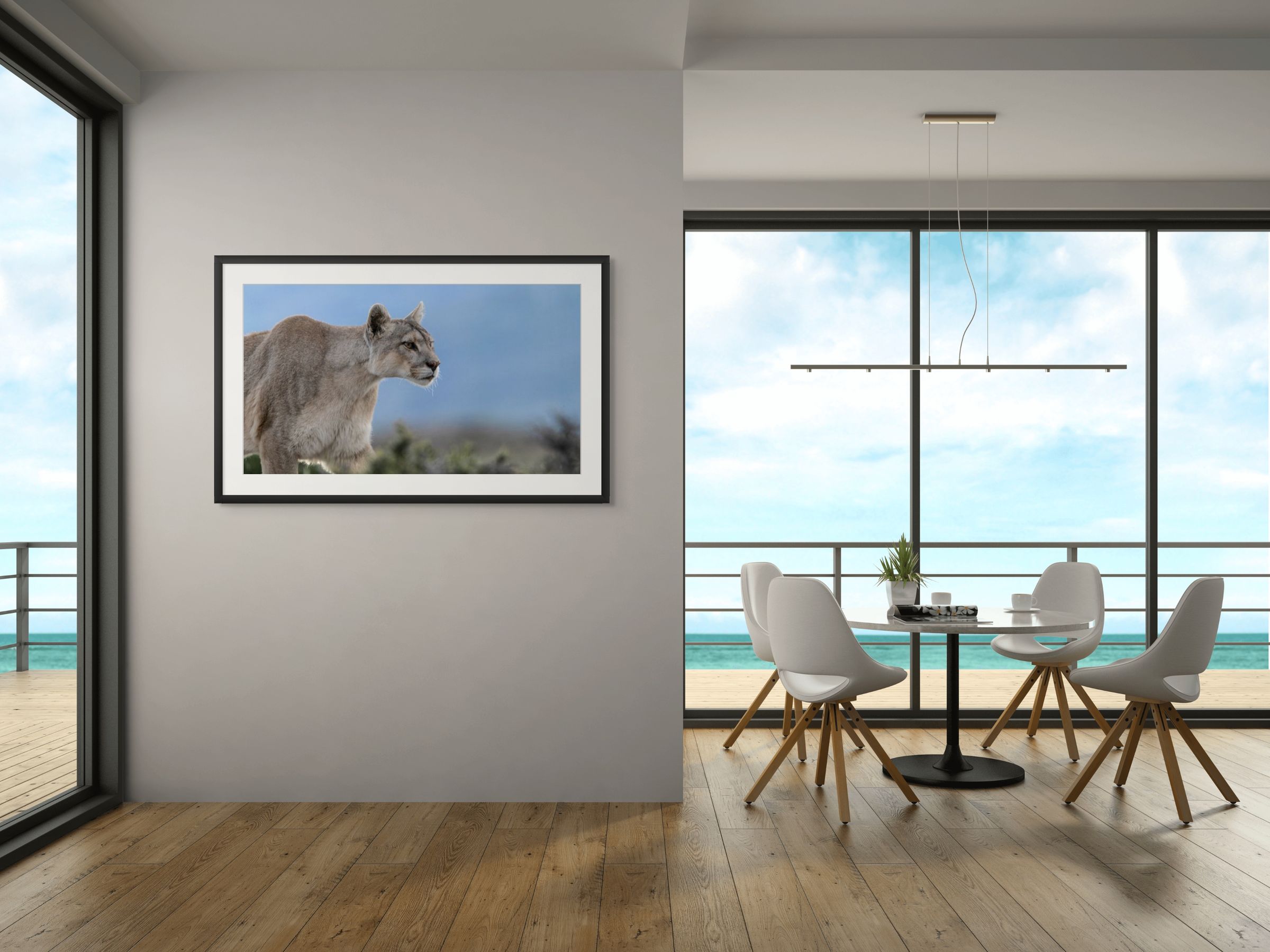This Puma slinks across the landscape in Torres del Paine, Chile. Imagine a puma moving silently across the rugged landscape, its sleek muscular body low to the ground as it prowls through the vast Patagonian steppe.